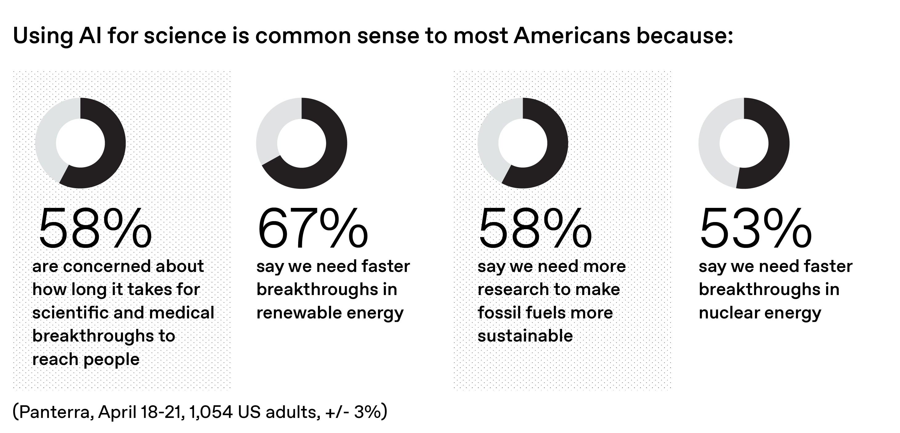 This work is grounded in our mission to ensure that artificial general intelligence benefits all of humanity. Science is one of the clearest, most direct ways that mission comes to life. The results of scientific progress are visible, testable, and shared. And when discovery moves faster, everyone benefits. Most Americans see AI in science and medicine as just common sense: 73% say we need new and innovative solutions to accelerate breakthroughs, and 69% call US leadership in science a top national priority.